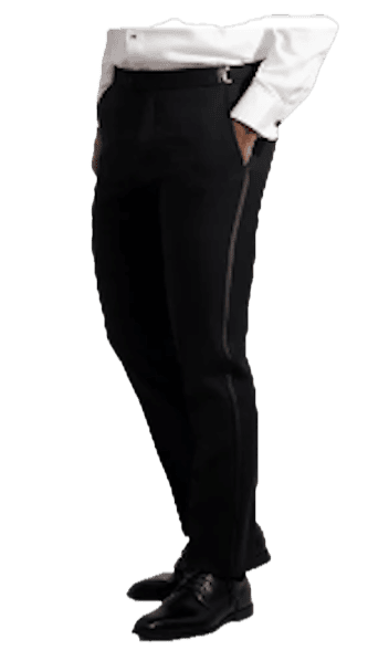 Mens Black wool formal Tuxedo pants featuring an ultra slim fit that hugs your legs for a modern silhouette.